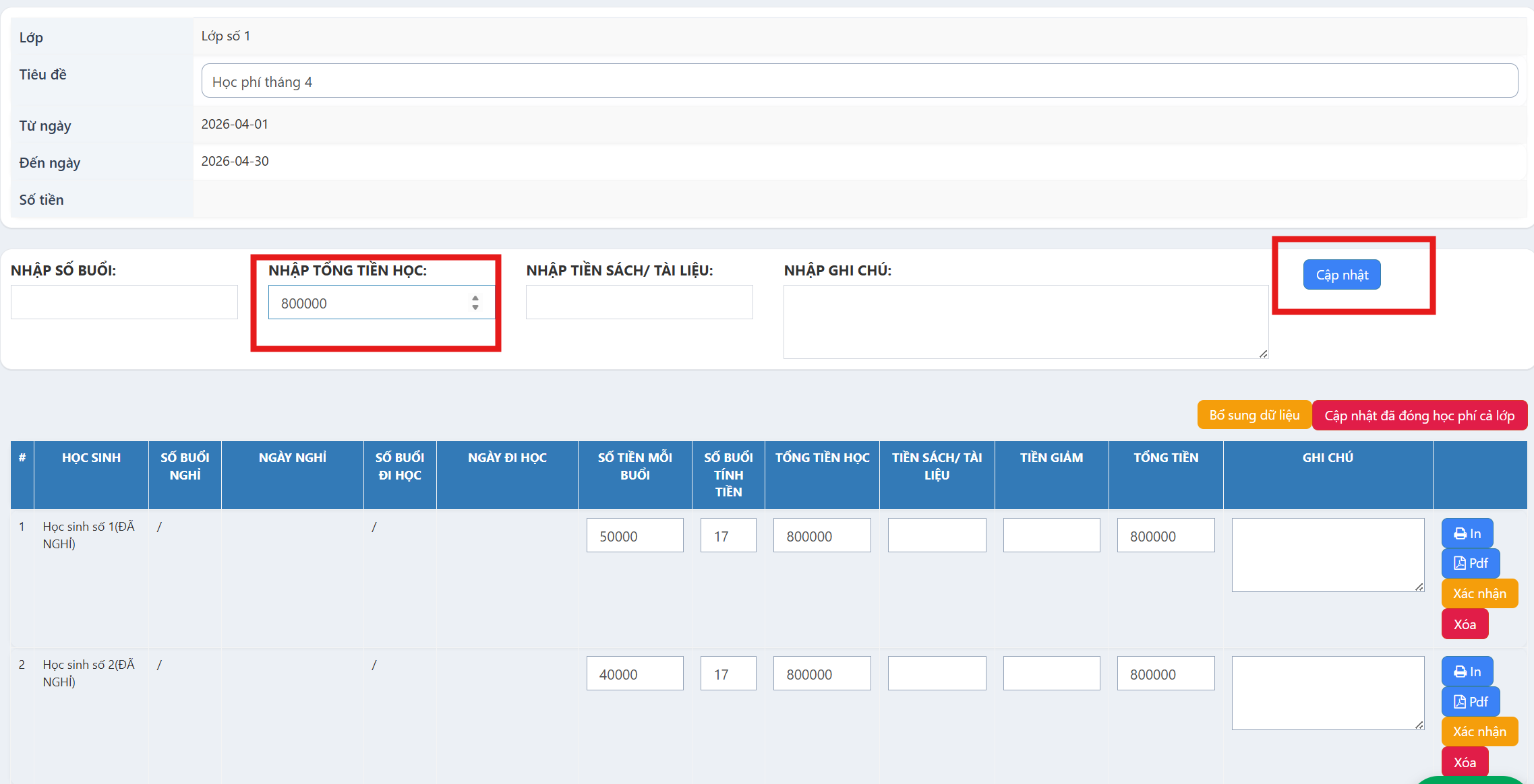 Bước 3: Cập nhật tổng số tiền học. Hệ thống sẽ gán toàn bộ số tiền của từng học sinh trong lớp theo số tiền này